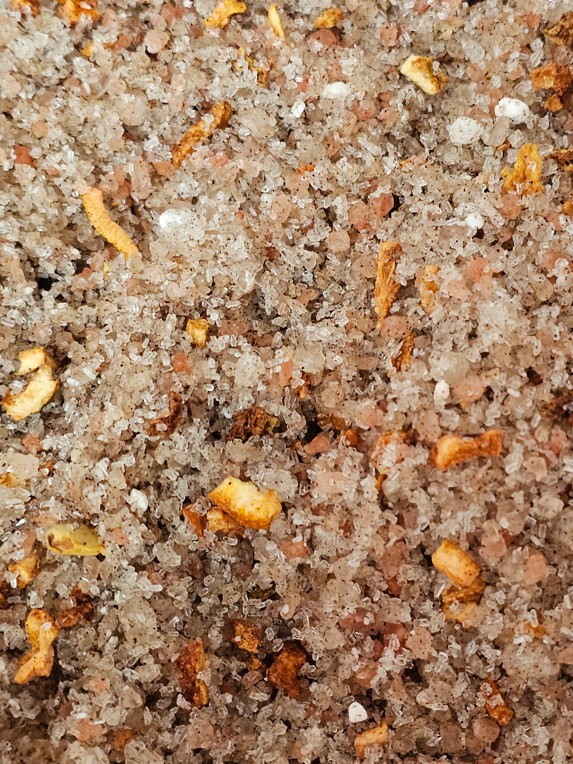 Ingredients: Epsom salt, pink Himalayan salt, Dead Sea salt, dried orange peel, jojoba oil, juniper berry powder, cinnamon leaf essential oil, pine essential oil, frankincense essential oil, cedarwood essential oil